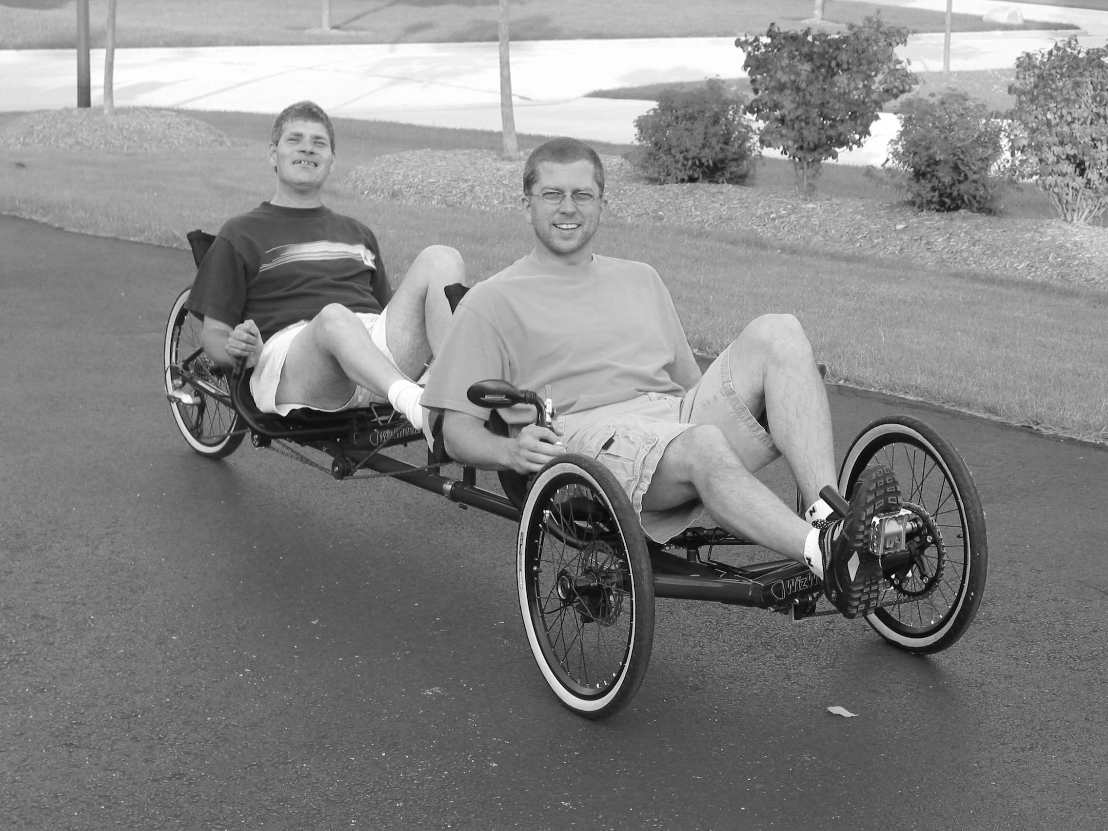 Predictably, Kevin’s interest in pedaling equaled his interest in paddling. He enjoyed riding the trike but didn’t contribute to its forward motion. In his position in the back seat, with his cycling helmet securely strapped and his bike shoes clamped to the pedals, he appeared as engaged as the driver in front with the same gear. As I pedaled, his feet and legs moved at an equal speed. We appeared as an efficient and capable team. We enjoyed this trike and used it often.